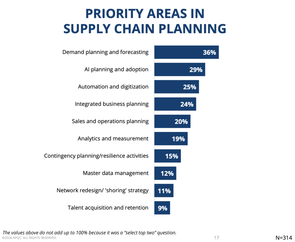 Supply chain planning has become the top organizational priority for 2026, cited by 93% of respondents, a notable shift from prior years when procurement dominated the agenda.